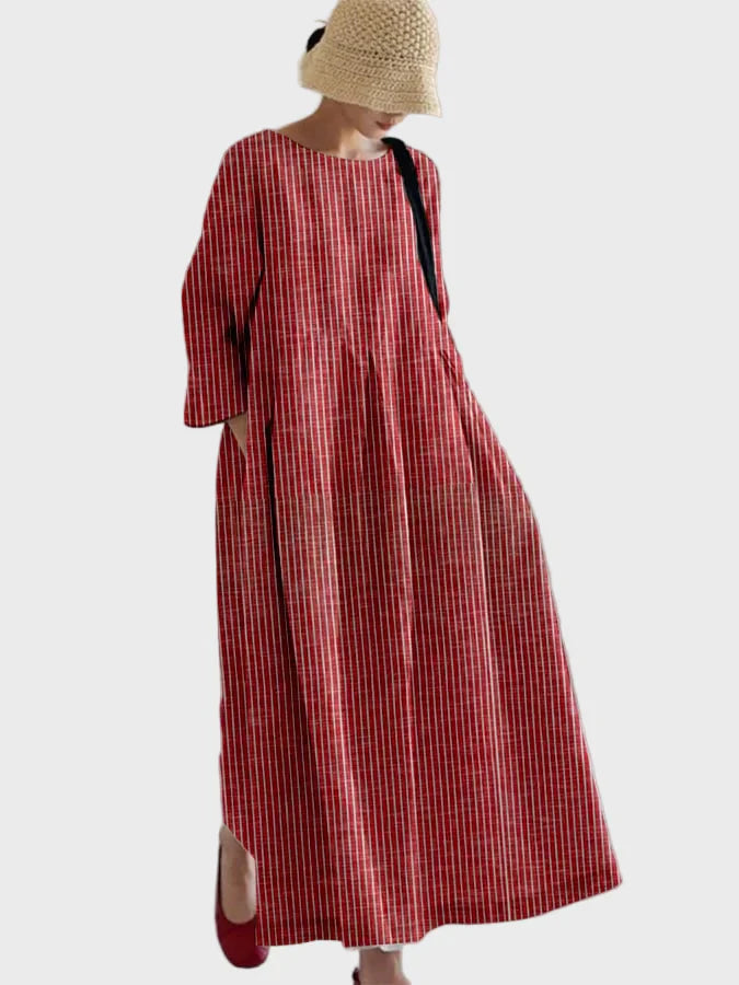 Give a sense of timeless elegance with this long red dress featuring vertical white stripes. The loose fit and three-quarter length sleeves offer comfort, while the length provides a sophisticated and airy appearance. Ideal for both casual and more elegant occasions.