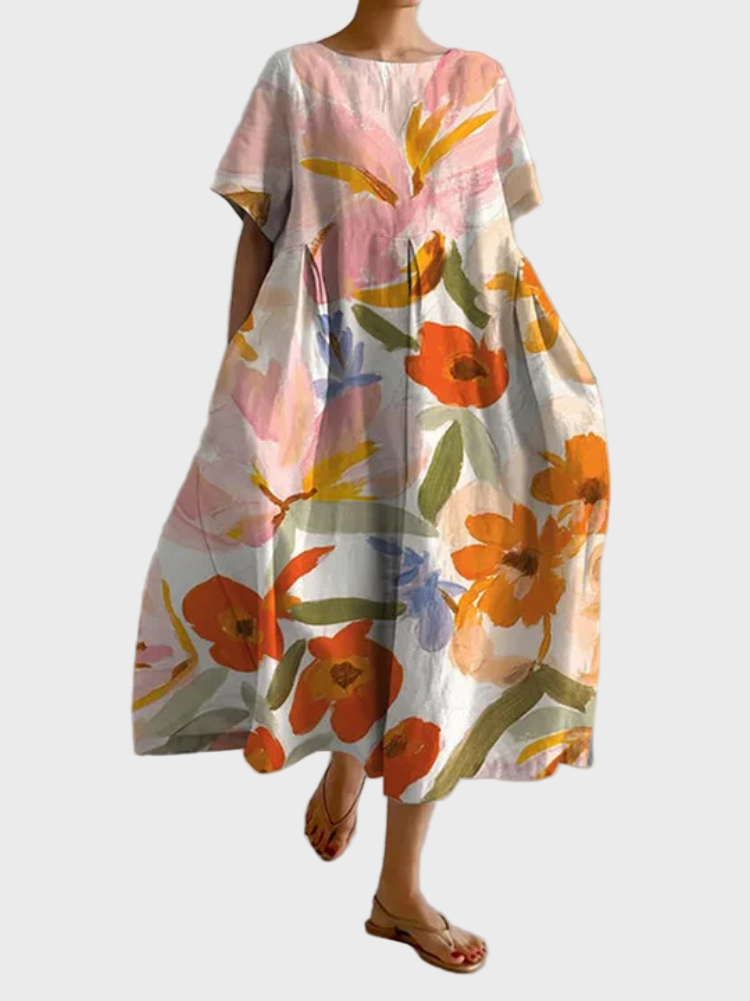 The Blooming Canvas is a dress that resembles a work of art, filled with colors and life. The intense floral brushstrokes in orange, pink, yellow, and blue create an impressive appearance that radiates freshness and femininity.