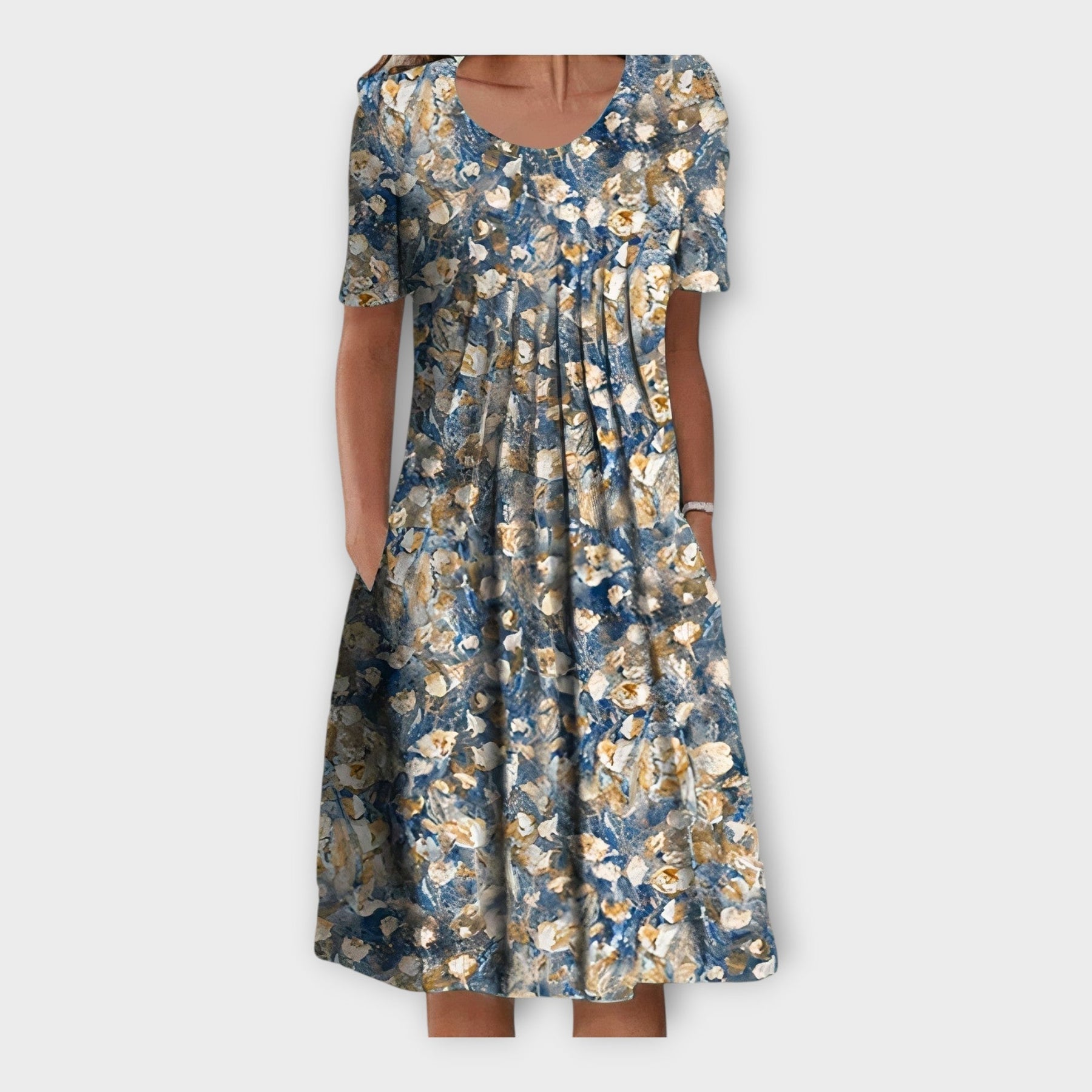 This floral dress offers a unique sense of freedom and femininity. With a comfortable fit, short sleeves, and pockets that add practicality, it is a suitable choice for walks, café visits, or daily activities in style.