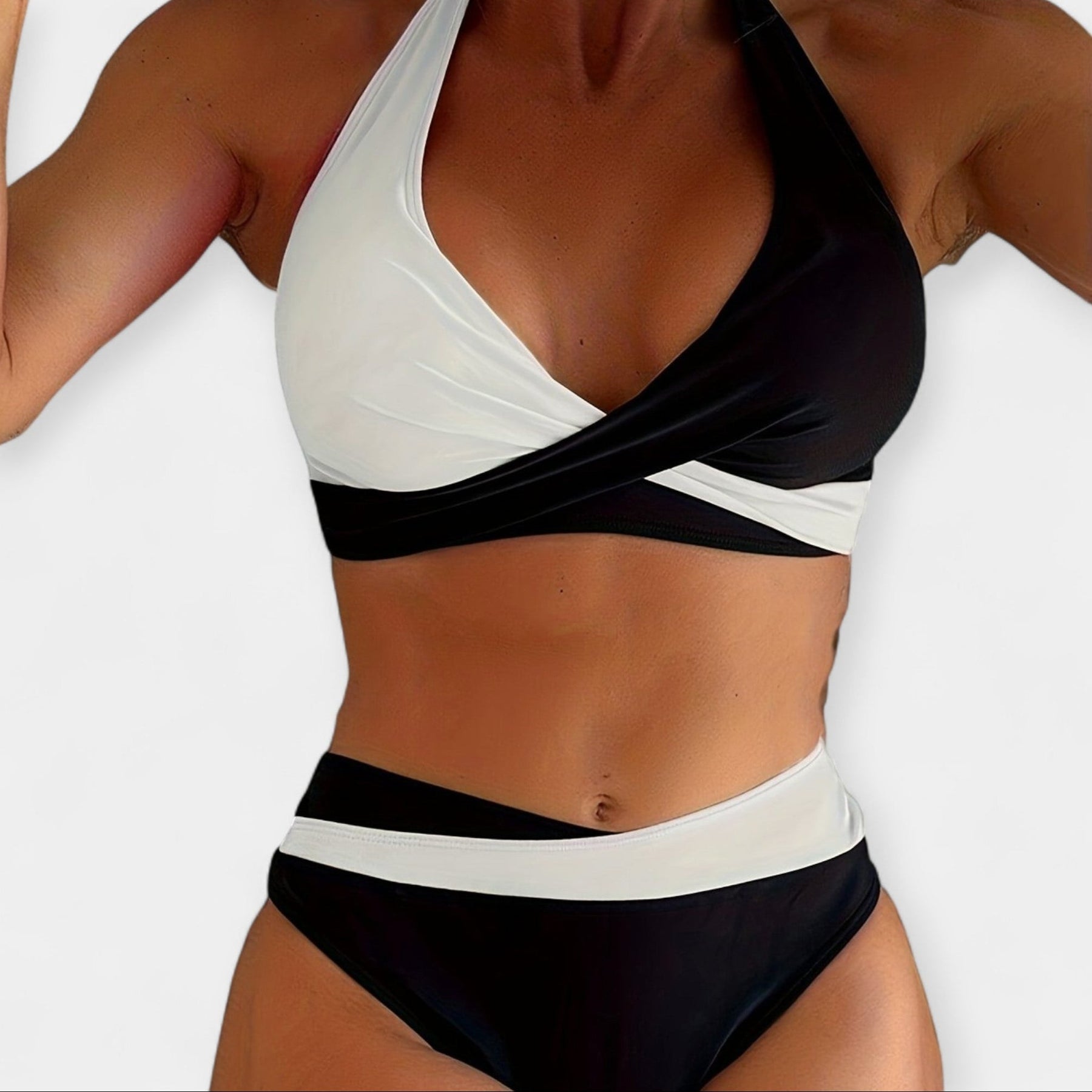 This sexy two-piece bikini impresses with its simple lines and the crossed detail at the neckline. It subtly highlights femininity, making it ideal for elegant appearances at the beach or your summer outings.