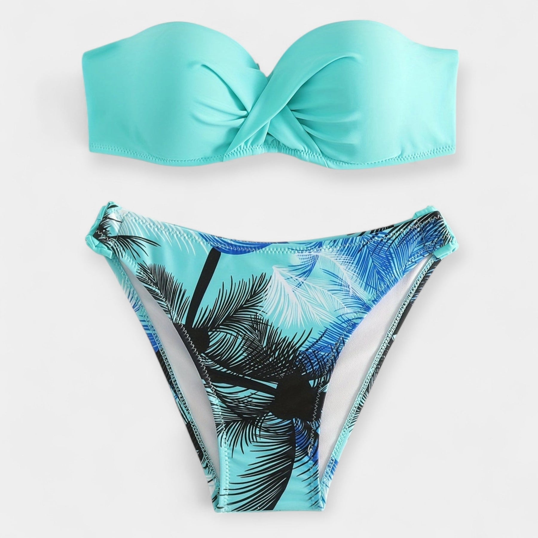 This interesting two-piece bikini combines exotic style and bold femininity. With stunning plant patterns, ribbon binding, and an open back, it accentuates the silhouette and gives a modern look to any summer event.